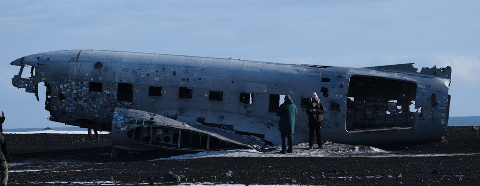 Next on our itinerary was the Sólheimasandur black beach, home to the remnants of a United States Navy DC plane that crash-landed in 1973 due to a fuel mix-up. It's a fascinating walk to the wreckage, though a bus option exists for those less inclined to trek 7 kilometres.